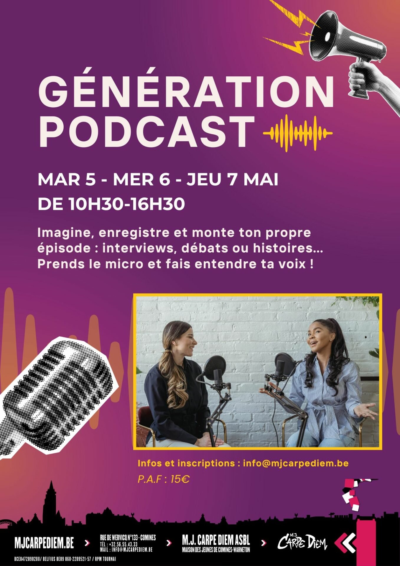 Pendant ce stage, les jeunes passent derrière le micro pour imaginer, enregistrer et produire leur propre podcast. Interviews, débats, storytelling… on explore les idées, on apprend les bases du son et on s’amuse à créer un épisode à écouter et partager !